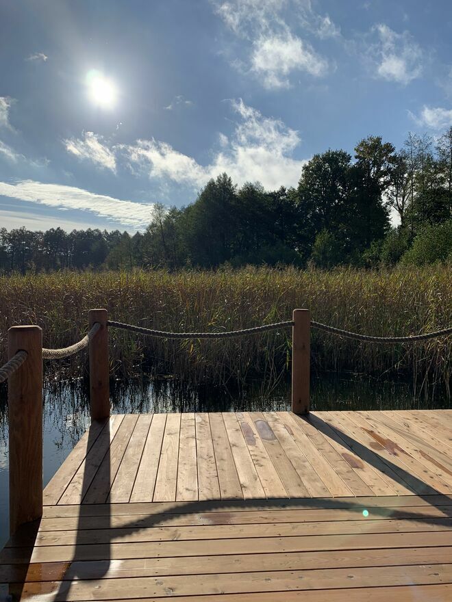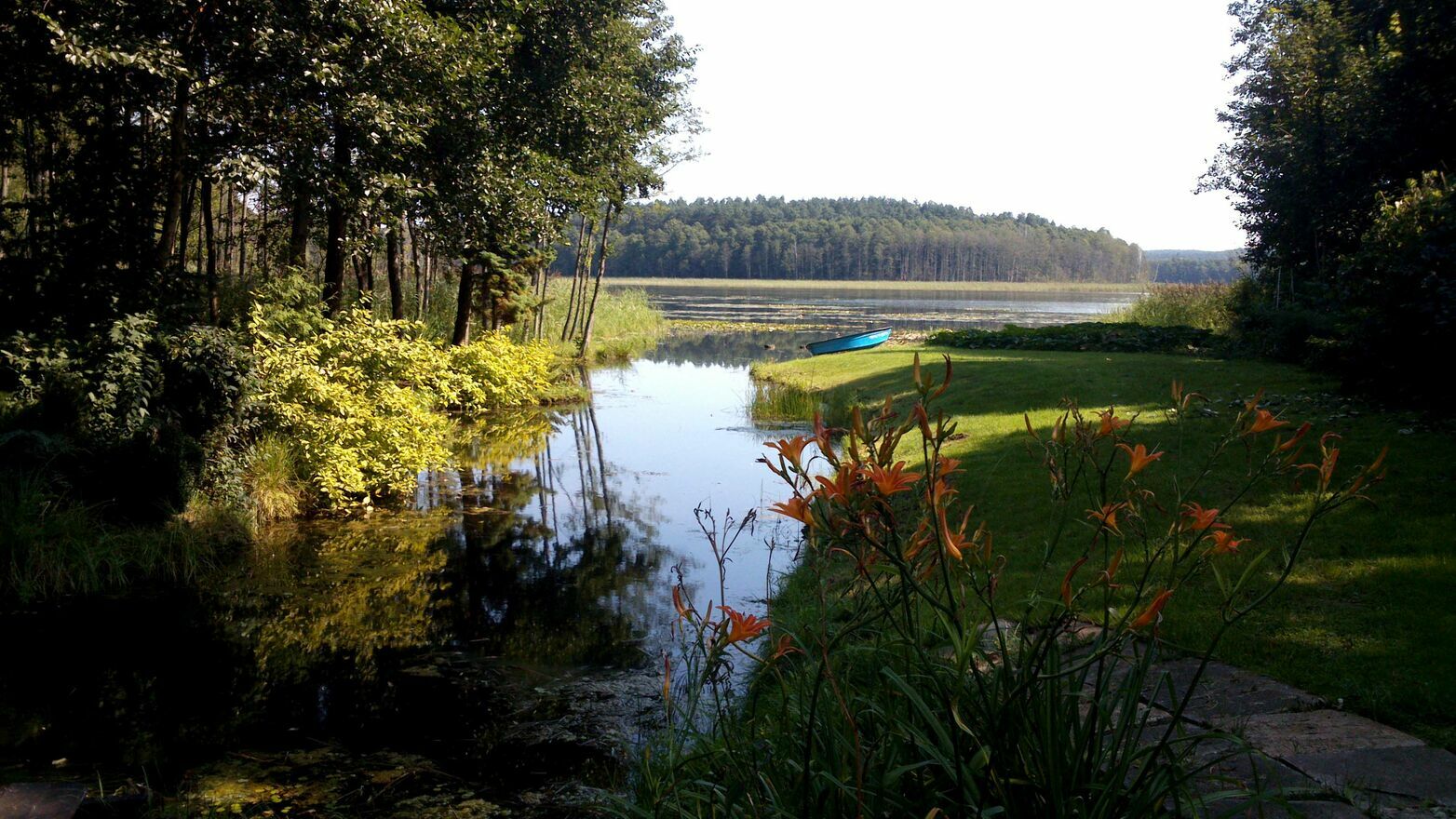 Dom Warmiński z linią brzegową jeziora i pomostem
