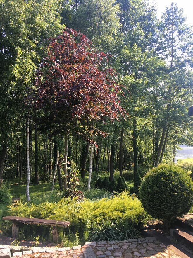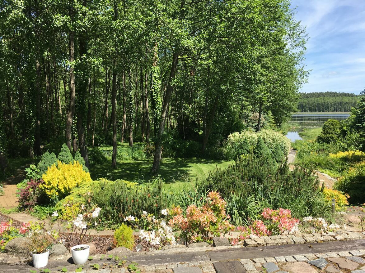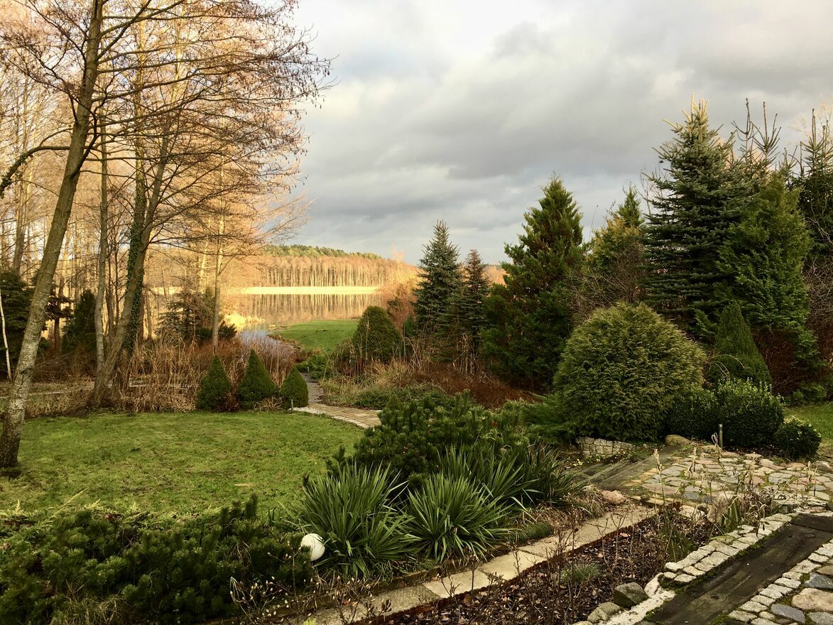 Działka jest ogrodzona, w ogrodzie bogate nasadzenia roślinne. Zachowany został cenny starodrzew. Ciągi komunikacyjne wyłożone zostały kostką granitową i kamieniami naturalnymi. Na działce znajduje się własna zatoczka z miejscem do cumowania sprzętu wodnego oraz pomost o konstrukcji aluminiowej z poszyciem drewnianym z drewna modrzewiowego. Dodatkowo na działce wybudowany jest mały budynek gospodarczy, zadaszone miejsce na składowanie drewna kominkowego oraz wędzarnia.